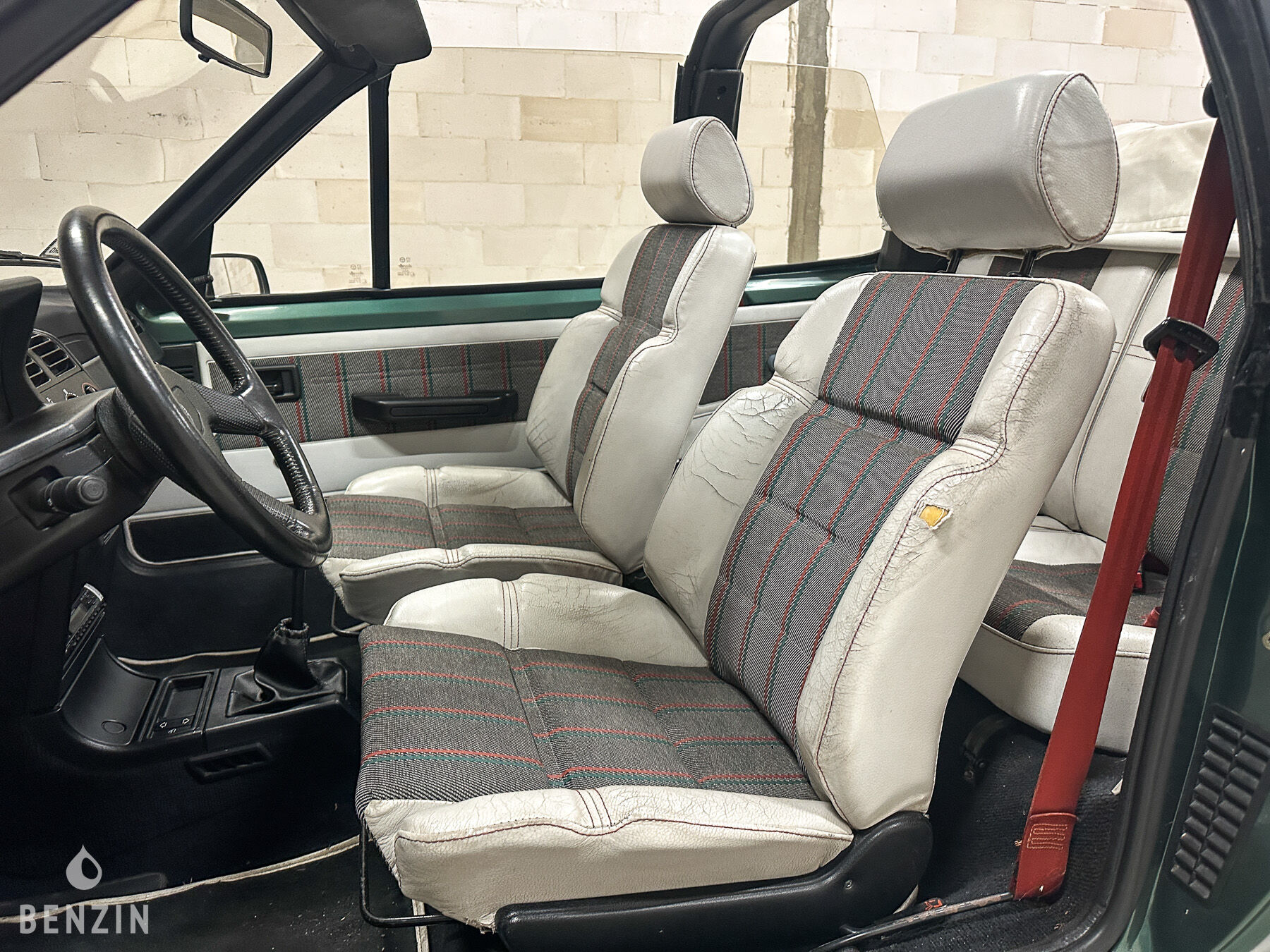 A belső tér jó állapotban van. A fehér utánzatú és kockás szövetből készült egyedi kárpitozáson a használat jelei látszanak. A kormánykerék és a műszerfal jó állapotban van. A fedélzeti műszerek és az elektromos berendezések normál működési állapotban vannak. Ez az autó a következő felszereltséggel rendelkezik: