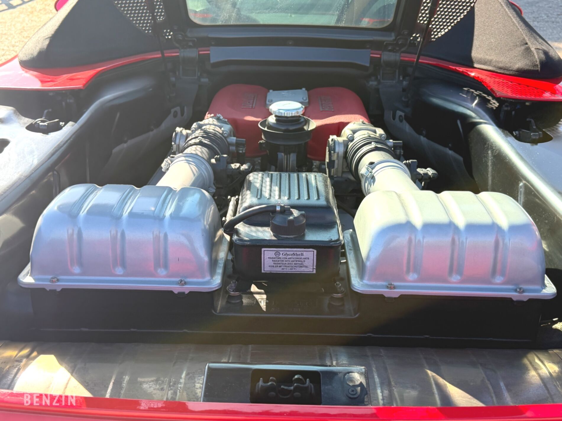 A l’extérieur, le vendeur indique que le véhicule est en très bon état. La carrosserie dans sa teinte Rosso Corsa ne présente aucun défaut majeur visible ; seuls quelques éclats mineurs sur le dessous du bouclier avant sont à noter.