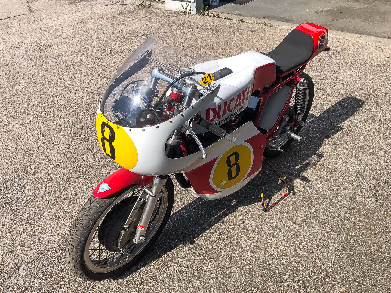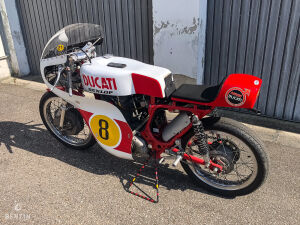 Esthétiquement, la moto est en bon état. La peinture dans sa teinte blanche et rouge ne présente que de rares défauts visibles dans la galerie. La selle ne comporte ni déchirures ni trous mais montre de légères traces d’usure. L’instrumentation ainsi que les équipements électriques fonctionnent normalement. Le vendeur précise que cette Ducati dispose de composants originaux de marque Ceriani / Borrani / Fontana, d’un double allumage, et de freins GP.