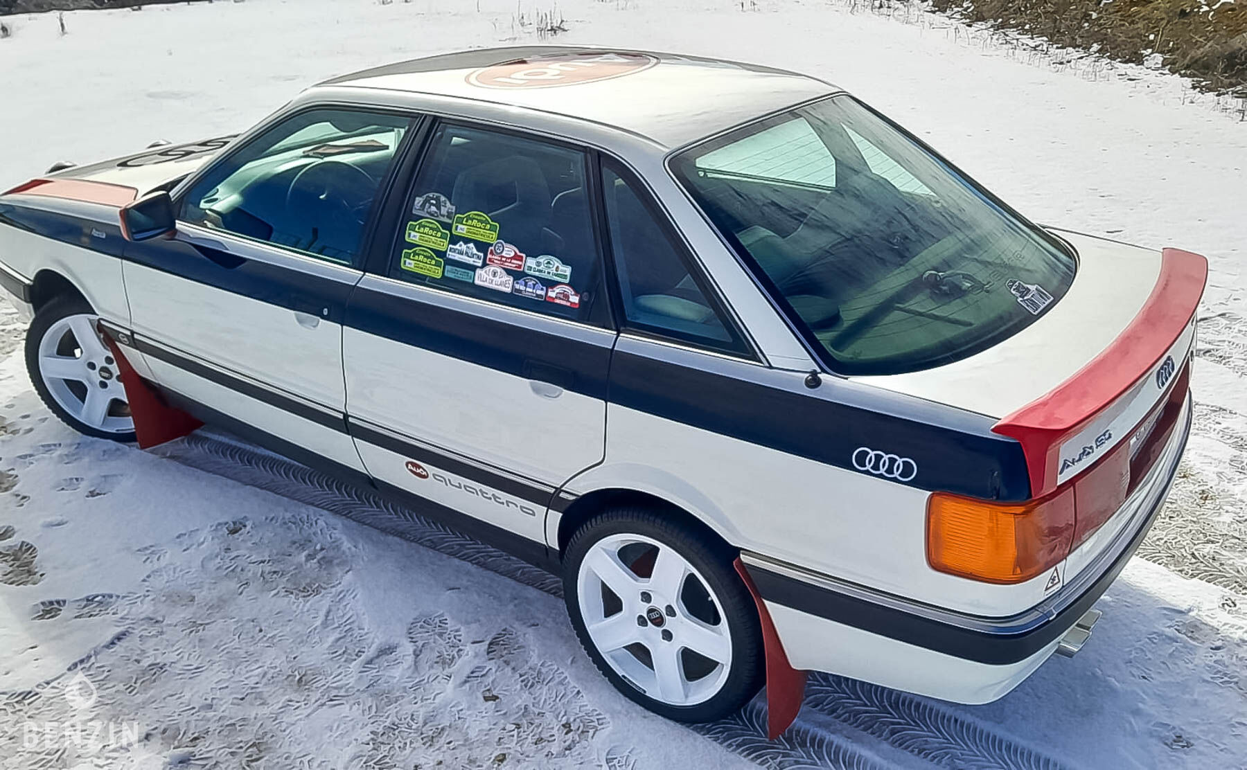 An der Außenseite gibt der Verkäufer an, dass das Fahrzeug in gutem Zustand ist. Die Karosserie in ihrer weißen Farbe weist nur einige Mängel auf, die in der Galerie sichtbar sind. Der Verkäufer weist darauf hin, dass auf Wunsch der Besitzerin dieses 90 Quattro die ursprünglich grüne Karosserie weiß lackiert und anschließend mit einem Audi Sport Covering versehen wurde. Fotos des Unterbodens sind in der Galerie zu sehen. Er weist auch darauf hin, dass die Unterböden 2019 eine Rostschutzbehandlung erhalten haben.