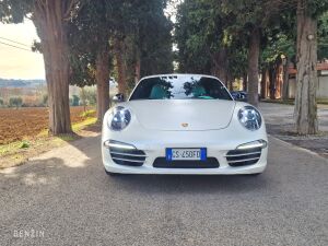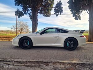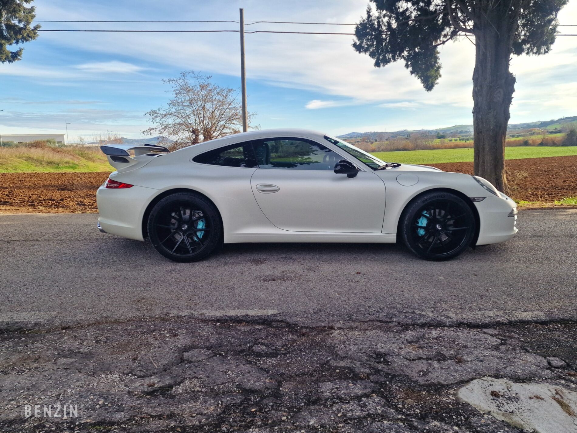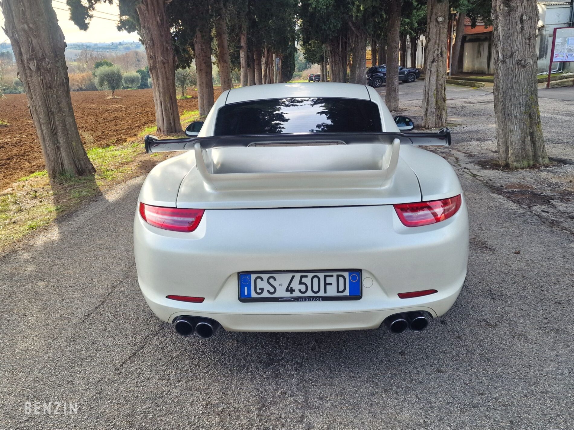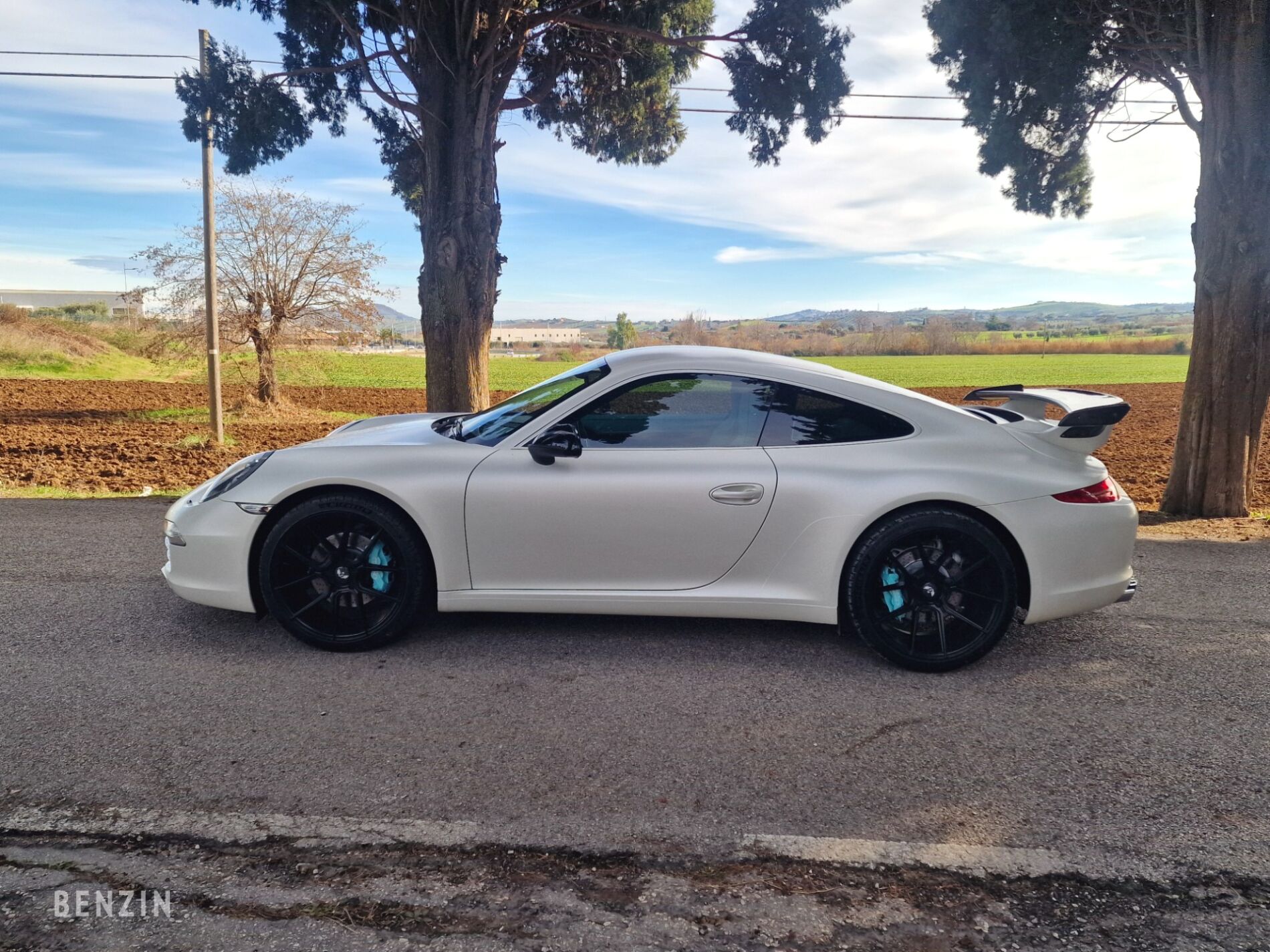 Cette Porsche 911 (991) 3.4 Carrera de 2014 d’origine Italienne est une 2ème main affichant 149.900 km, kilométrage certifié par son carnet d'entretien Porsche. Le vendeur indique que le véhicule est en très bon état général. Ce véhicule dispose d'une personnalisation esthétique unique avec un wrap blanc mat posé sur sa peinture d'origine Noir Métallisé, ainsi qu'un kit carrosserie look GT3.
