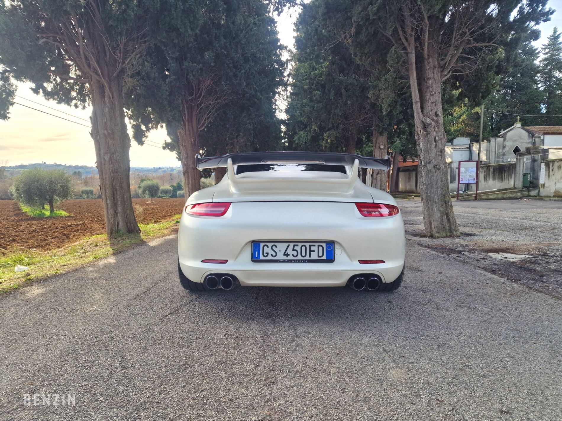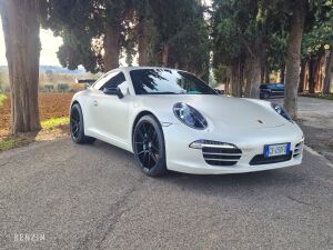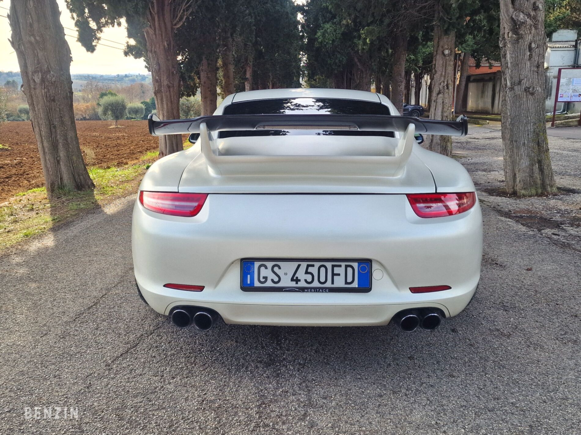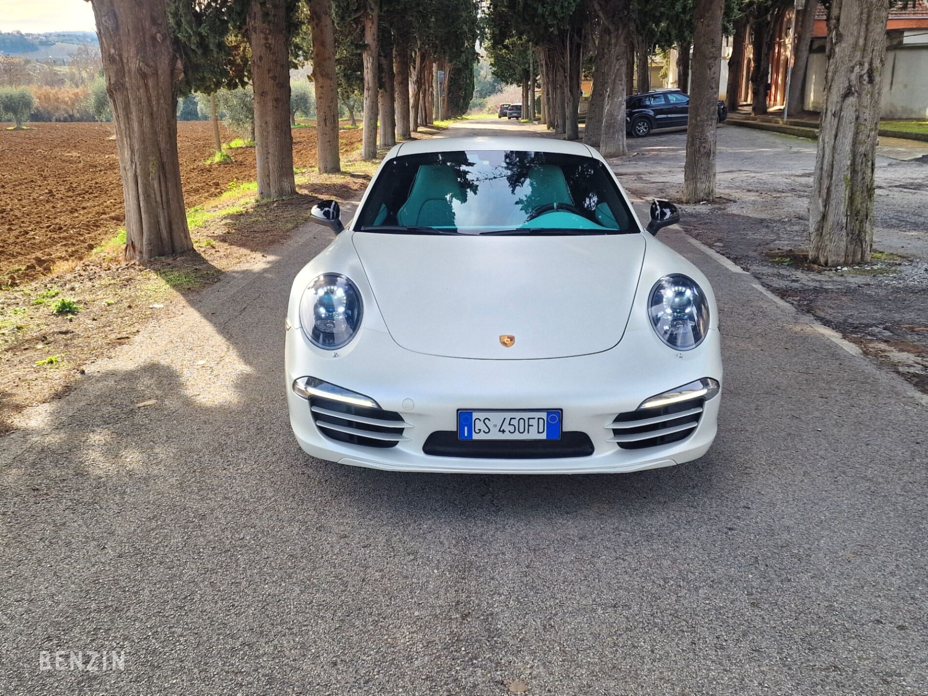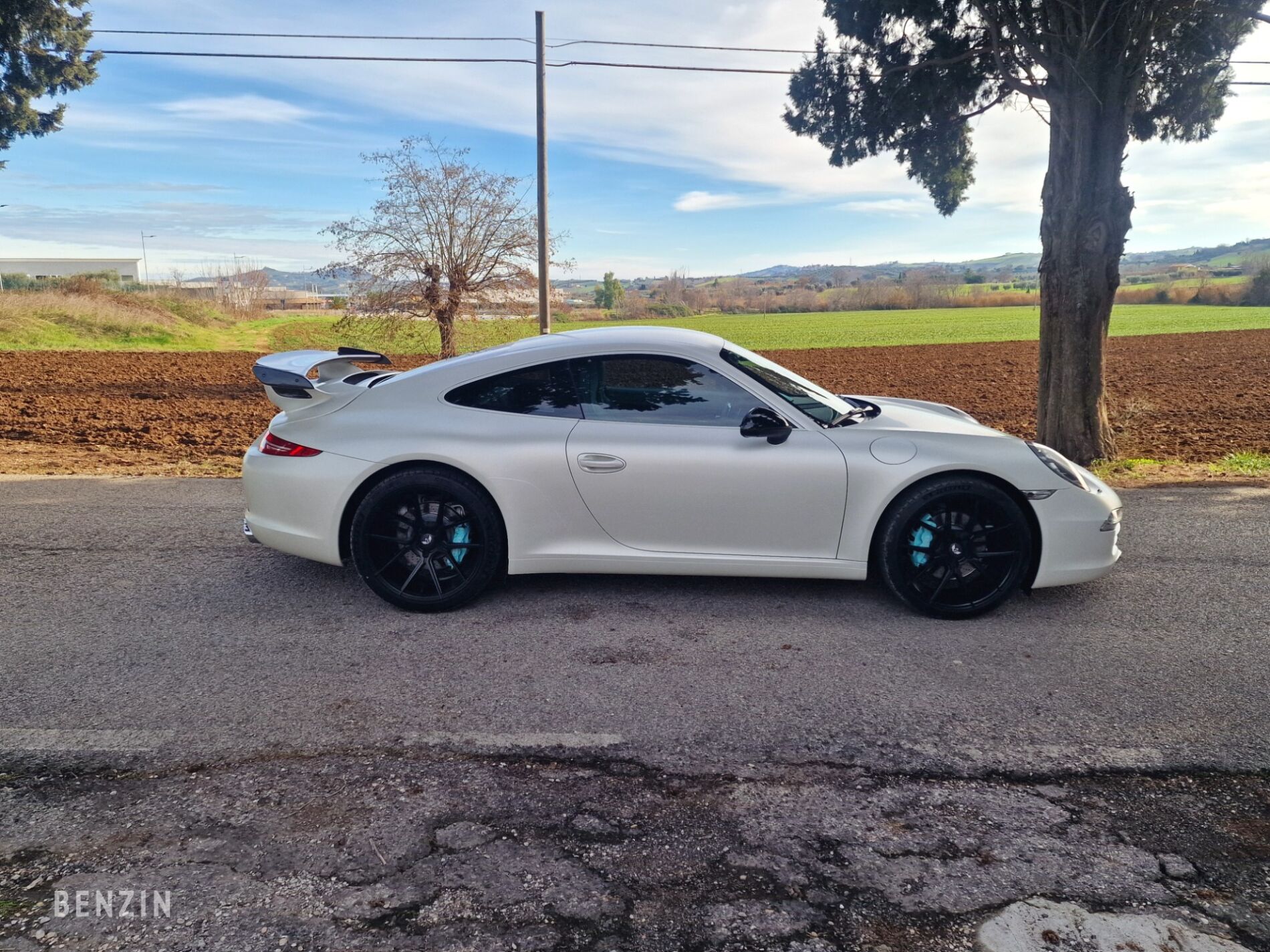 Cette Porsche 911 (991) 3.4 Carrera de 2014 d’origine Italienne est une 2ème main affichant 149.900 km, kilométrage certifié par son carnet d'entretien Porsche. Le vendeur indique que le véhicule est en très bon état général. Ce véhicule dispose d'une personnalisation esthétique unique avec un wrap blanc mat posé sur sa peinture d'origine Noir Métallisé, ainsi qu'un kit carrosserie look GT3.