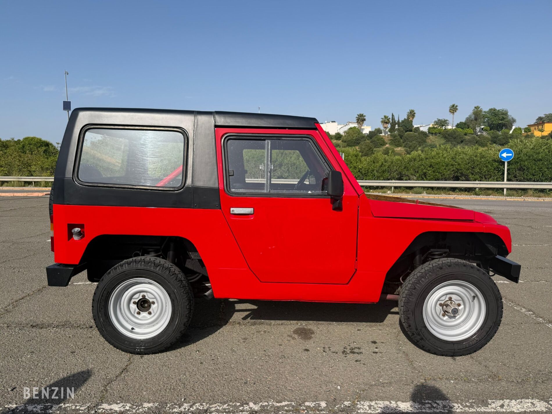 A l’extérieur, le vendeur indique que le véhicule est en bon état. La carrosserie dans sa teinte rouge présente un bel aspect général suite à une peinture récente ; le vendeur note toutefois de légères imperfections de finition sur les charnières de porte arrière et quelques traces d'usage sur les pare-chocs.