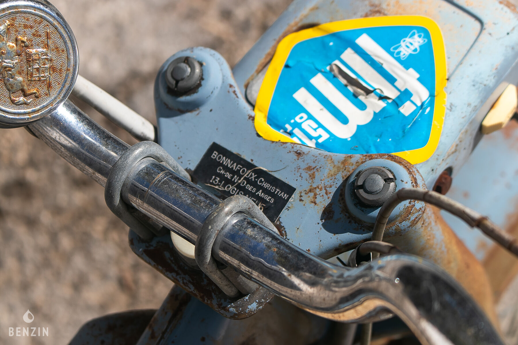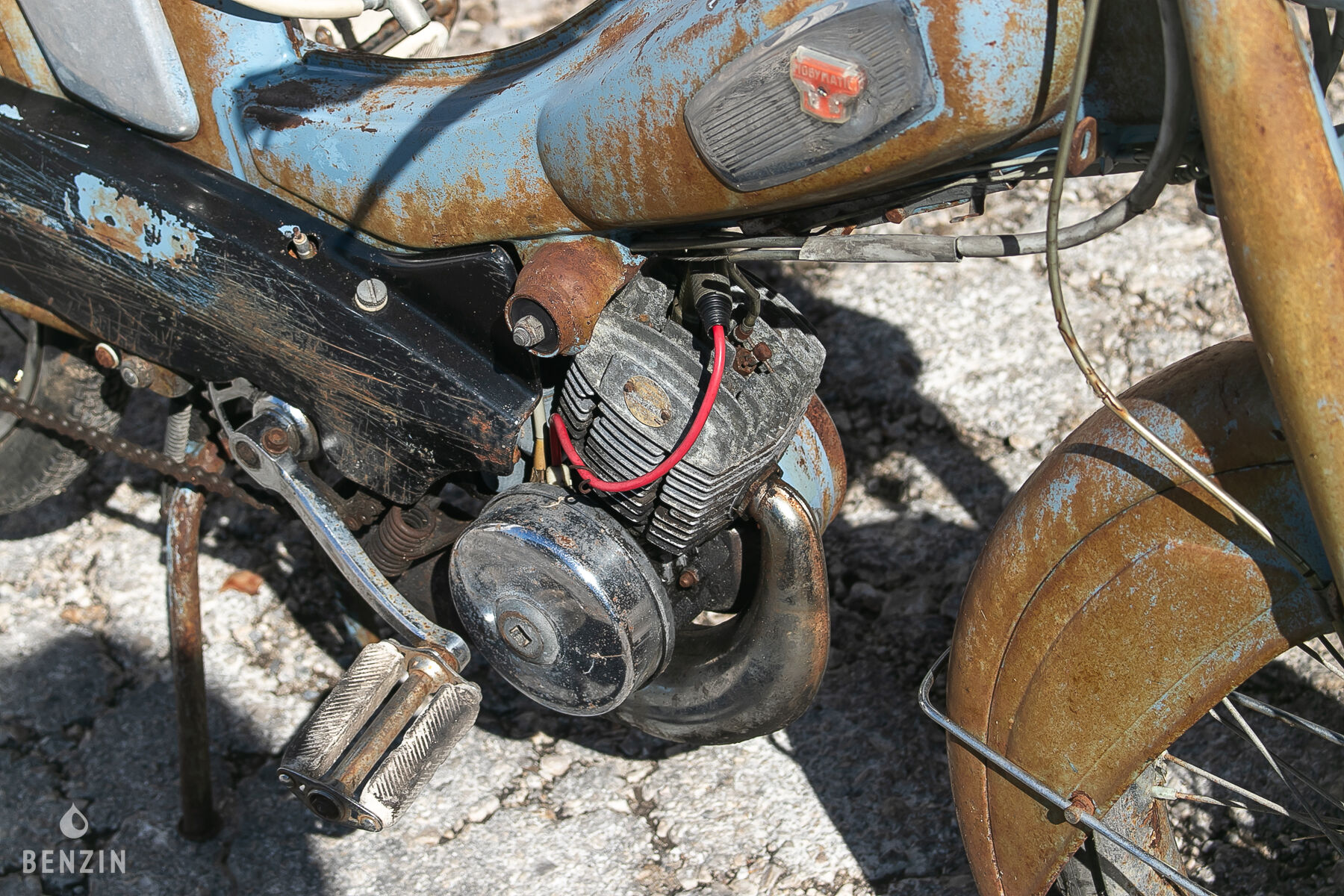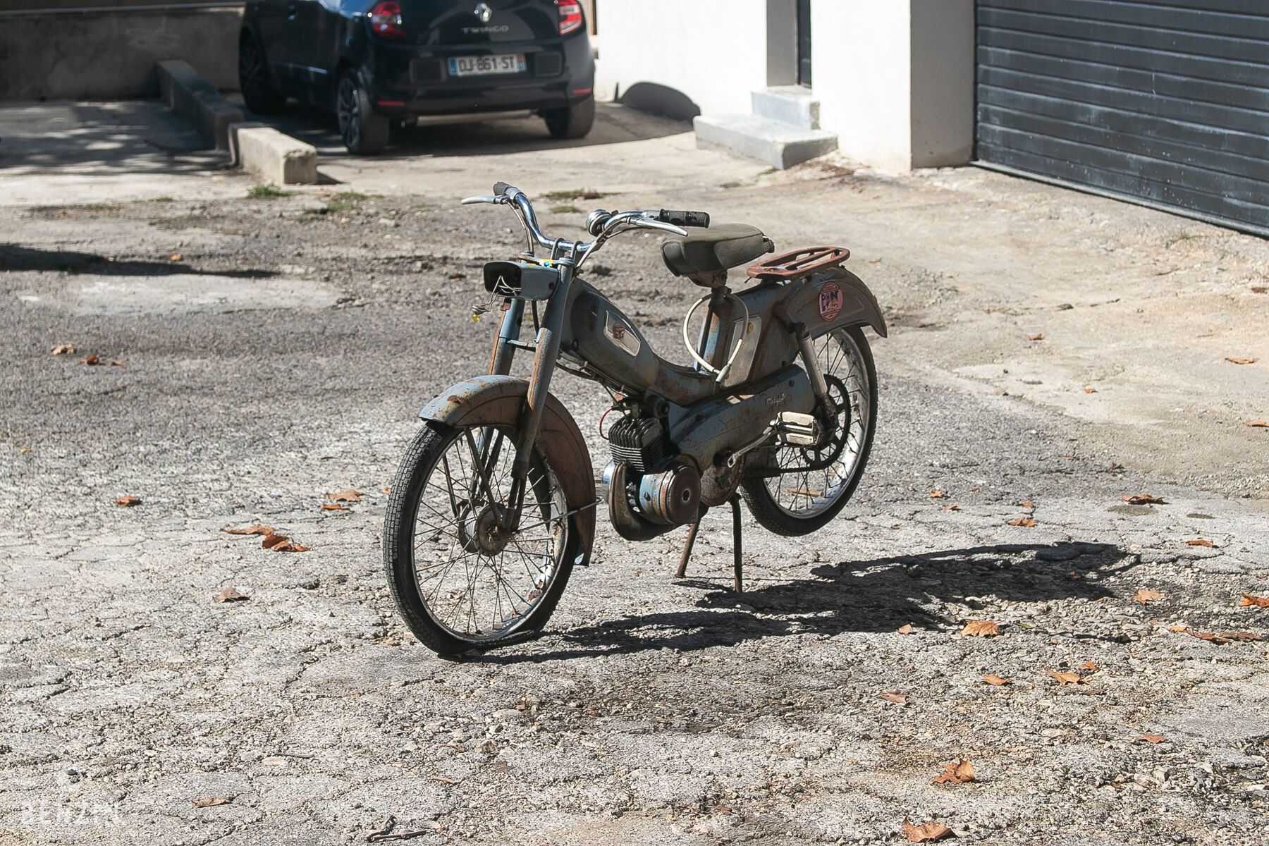 La mobylette dispose de ses jantes d’origine, chaussées de pneus anciens. La fourche, le bras oscillant et la chaîne sont en mauvais état.