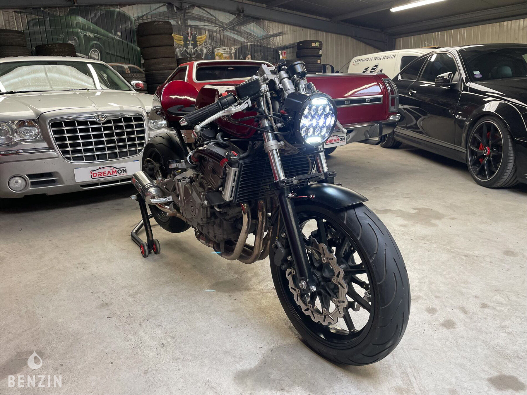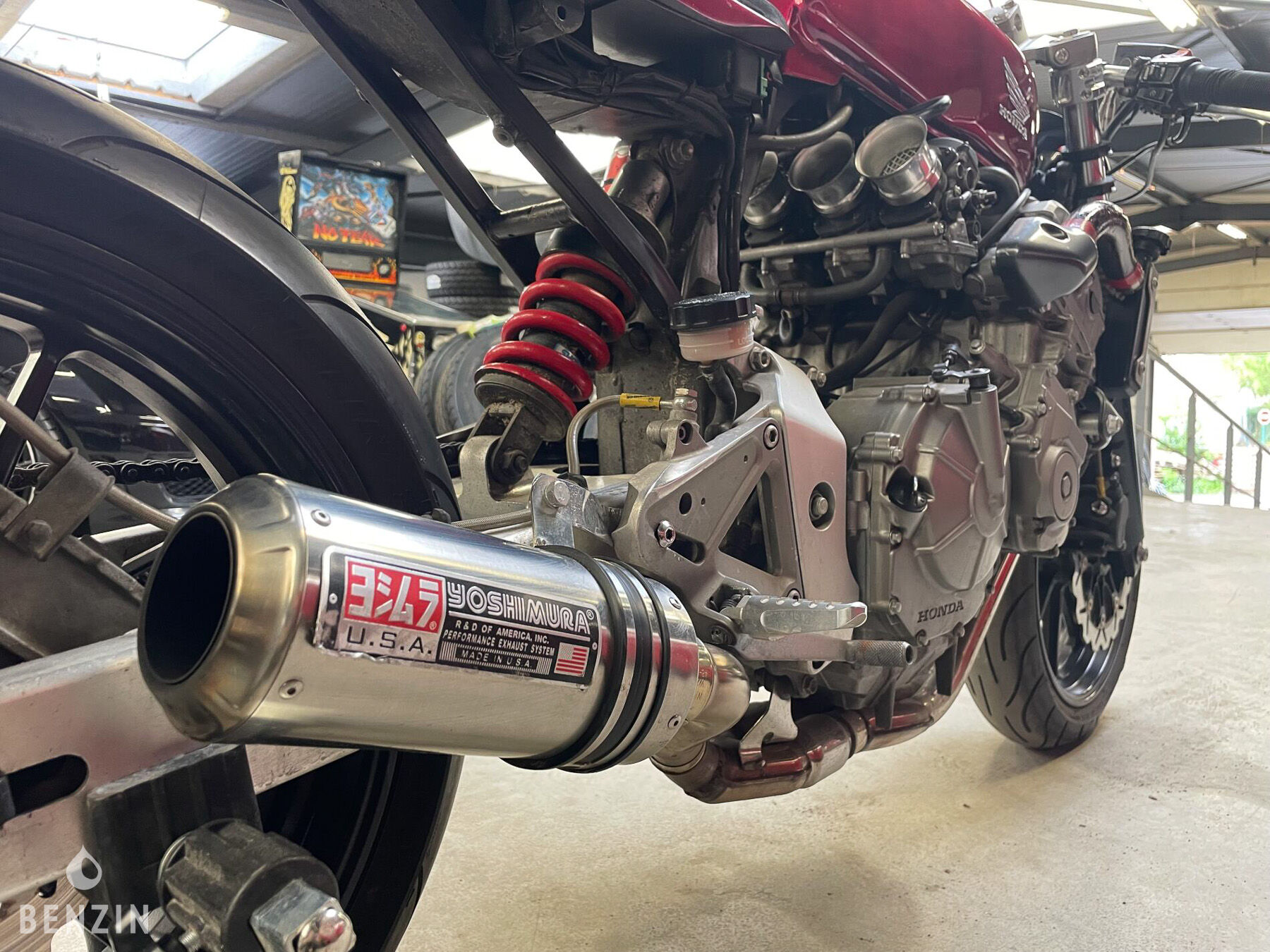 Esthétiquement, la moto est en très bon état. La peinture dans sa teinte rouge ne présente que de rares défauts visibles dans la galerie. Les éléments de carosserie sont en bon état, tout comme les optiques. La selle sur mesure en simili noir ne comporte ni déchirures ni trous mais montre de légères traces d’usure. L’instrumentation ainsi que les équipements électriques fonctionnent normalement. Cette Hornet a bénéficié des modifications suivantes :