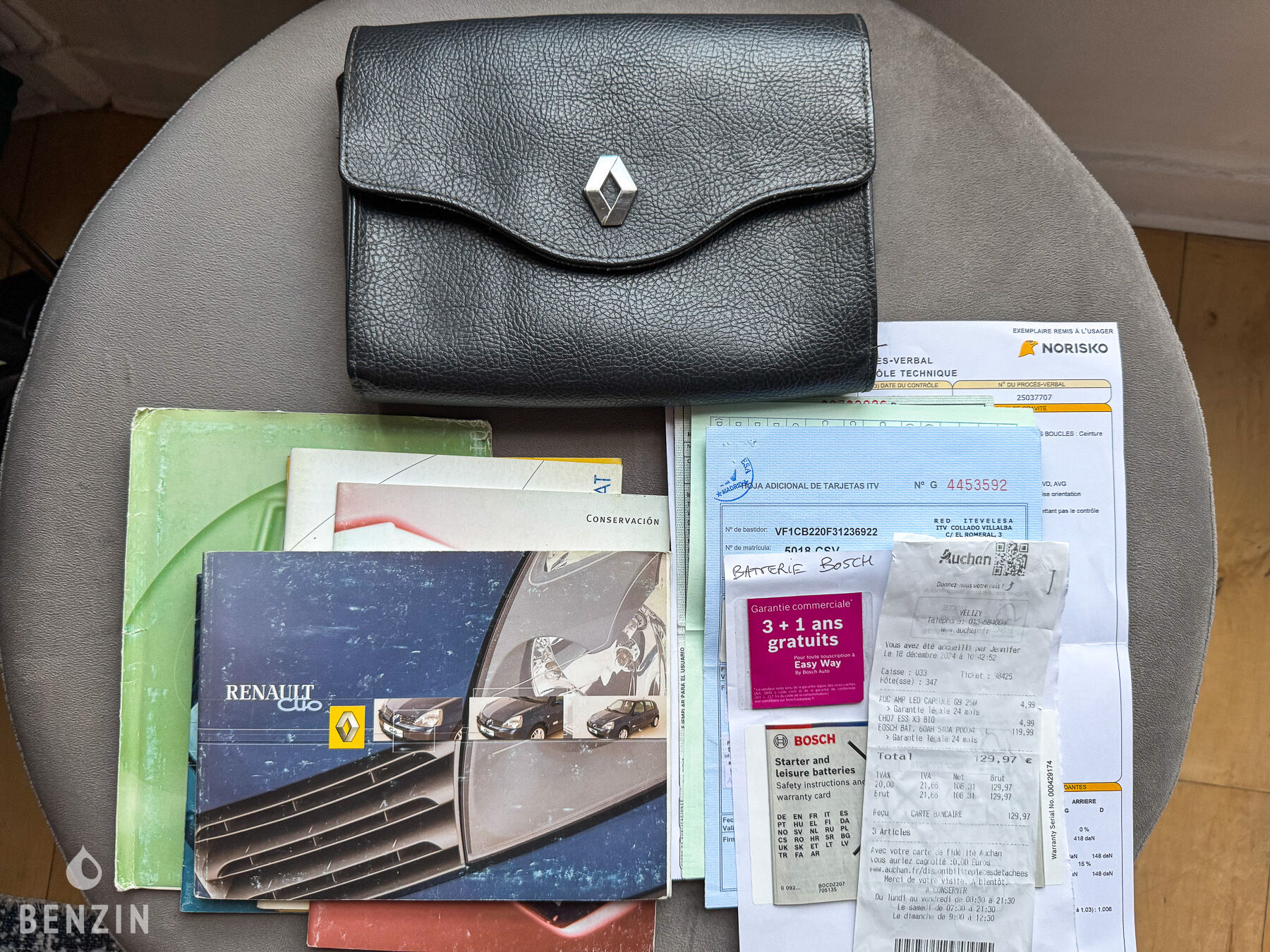 La voiture dispose de ses 4 jantes d’origine en état moyen, chaussées de pneus en bon état. La voiture freine normalement. Le vendeur précise que la voiture dispose de ressorts courts. Cela entraîne un frottement de la roue avant droite lors de braquage important (audible en vidéo).