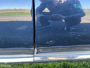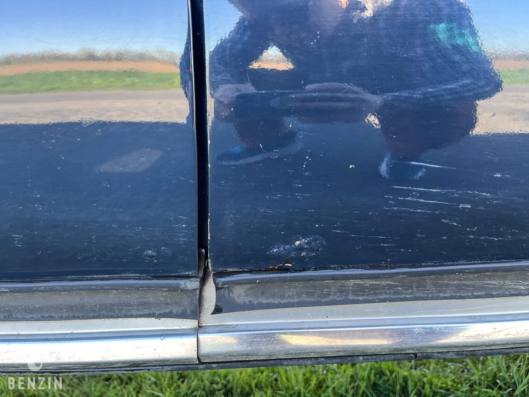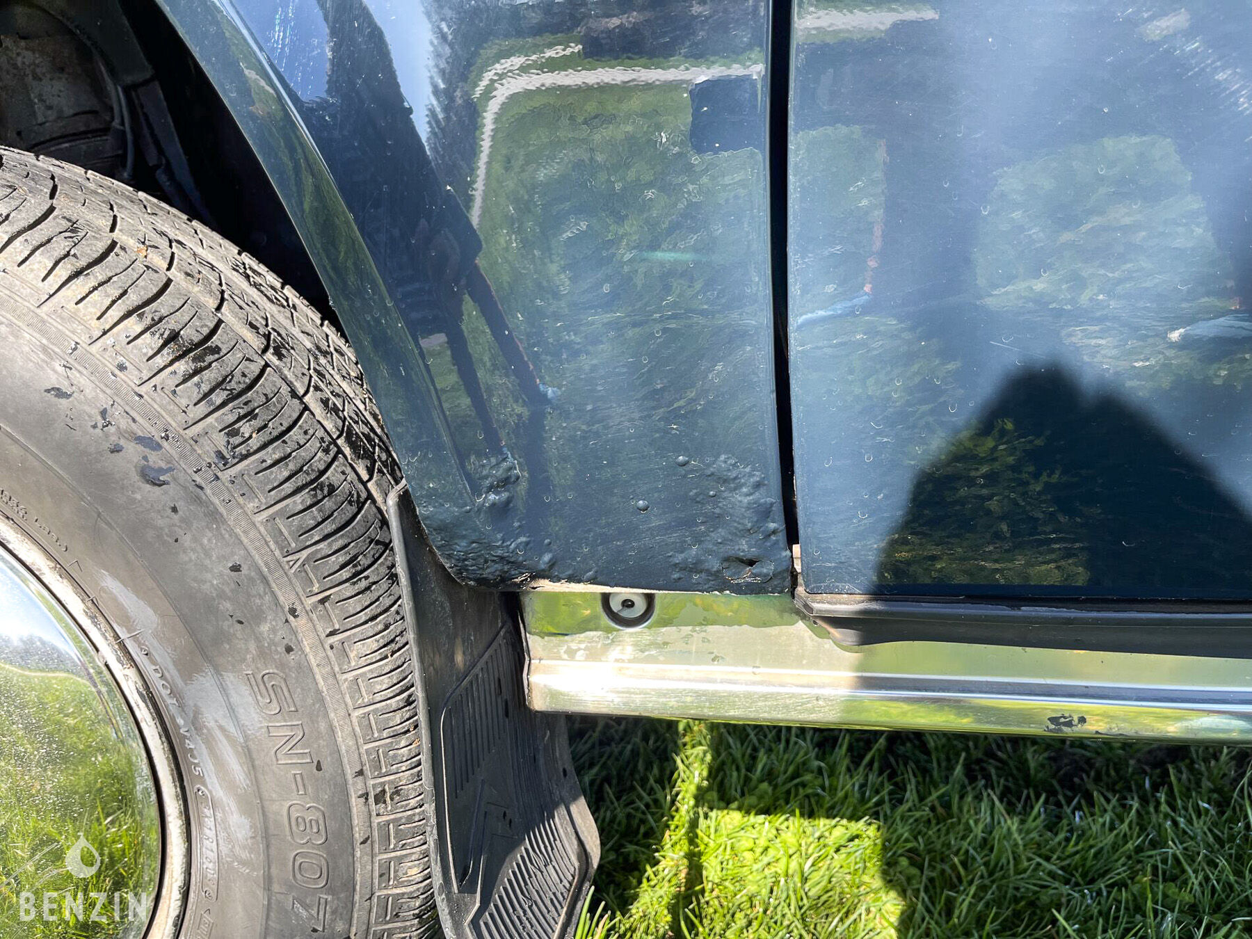 A l’extérieur, le vendeur indique que le véhicule est en état moyen. La carrosserie dans sa teinte noire présente des défauts visibles dans la galerie. Le vendeur signale de la corrosion sur les portes et l’aile avant gauche. Des photos des soubassements sont disponibles dans la galerie.