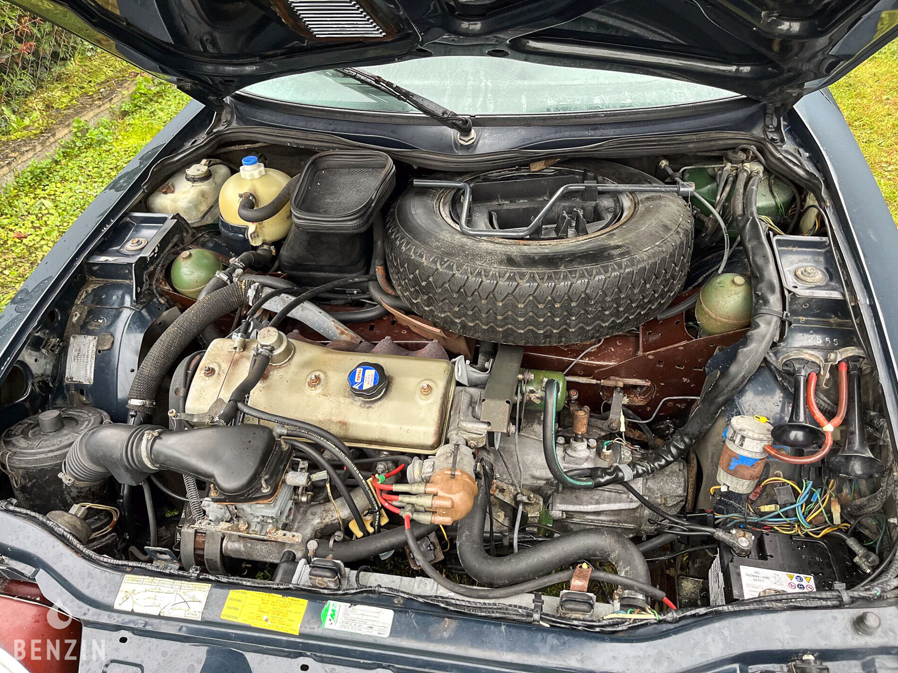 A l’intérieur, le vendeur indique que le véhicule est en état moyen. La sellerie en tissu gris est en mauvais état. Le volant et le tableau de bord sont en bon état. On notera un affaissement de la garniture des montants, le vendeur précise que les guide de vitres avant sont cassés. L’instrumentation de bord ainsi que les équipements électriques fonctionnent normalement.