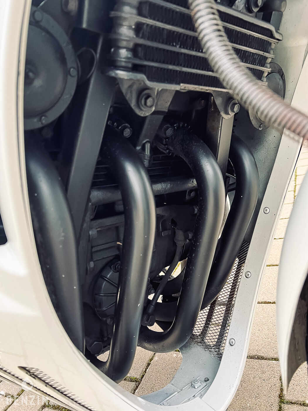 Esthétiquement, la moto est en bon état. La peinture dans sa teinte blanche et rouge ne présente que de rares défauts visibles dans la galerie. Les plastiques sont en bon état, tout comme les optiques. La selle en simili noir ne comporte ni déchirures ni trous mais montre de légères traces d’usure. L’instrumentation ainsi que les équipements électriques fonctionnent normalement.