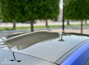 A l’extérieur, le vendeur indique que le véhicule est en très bon état. La carrosserie dans sa teinte frozen blue ne présente pas de défauts notables.