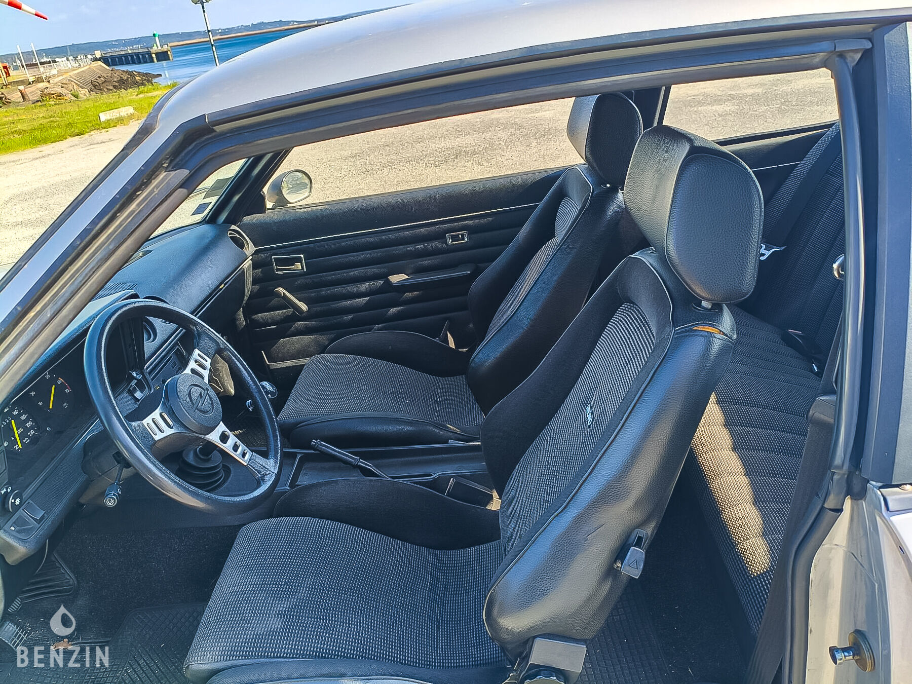 L’intérieur est en bon état. La sellerie en tissu gris Recaro montre quelques traces d’usure. Le vendeur indique que la banquette arrière présente un petit trou. Le volant et le tableau de bord sont en bon état, le plastique de la colonne de direction présente quelques défauts. La radio et les hauts parleurs ne sont pas d’origine. Cette Manta dispose des équipements suivants :