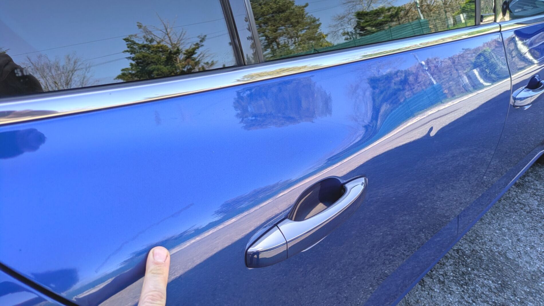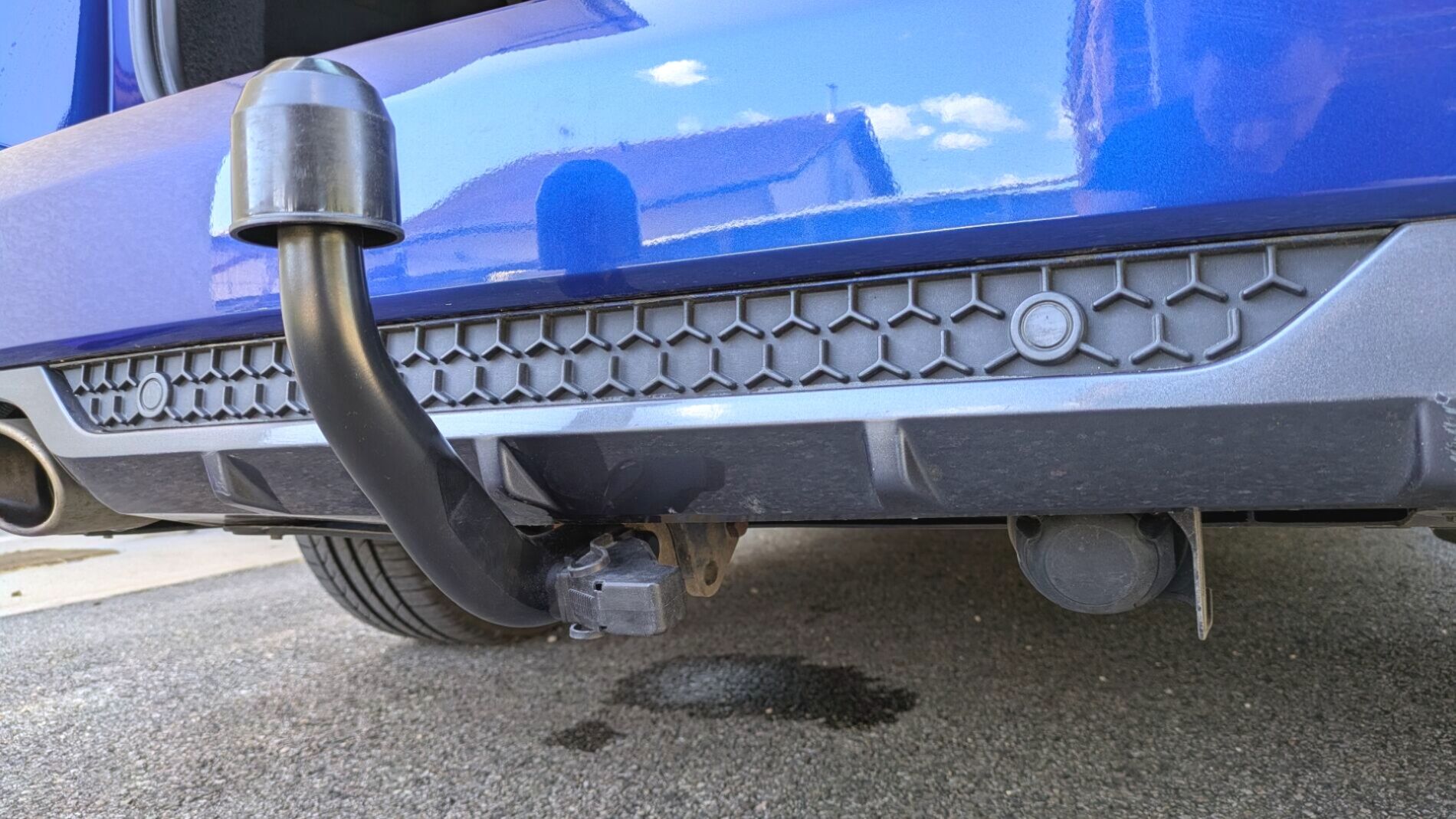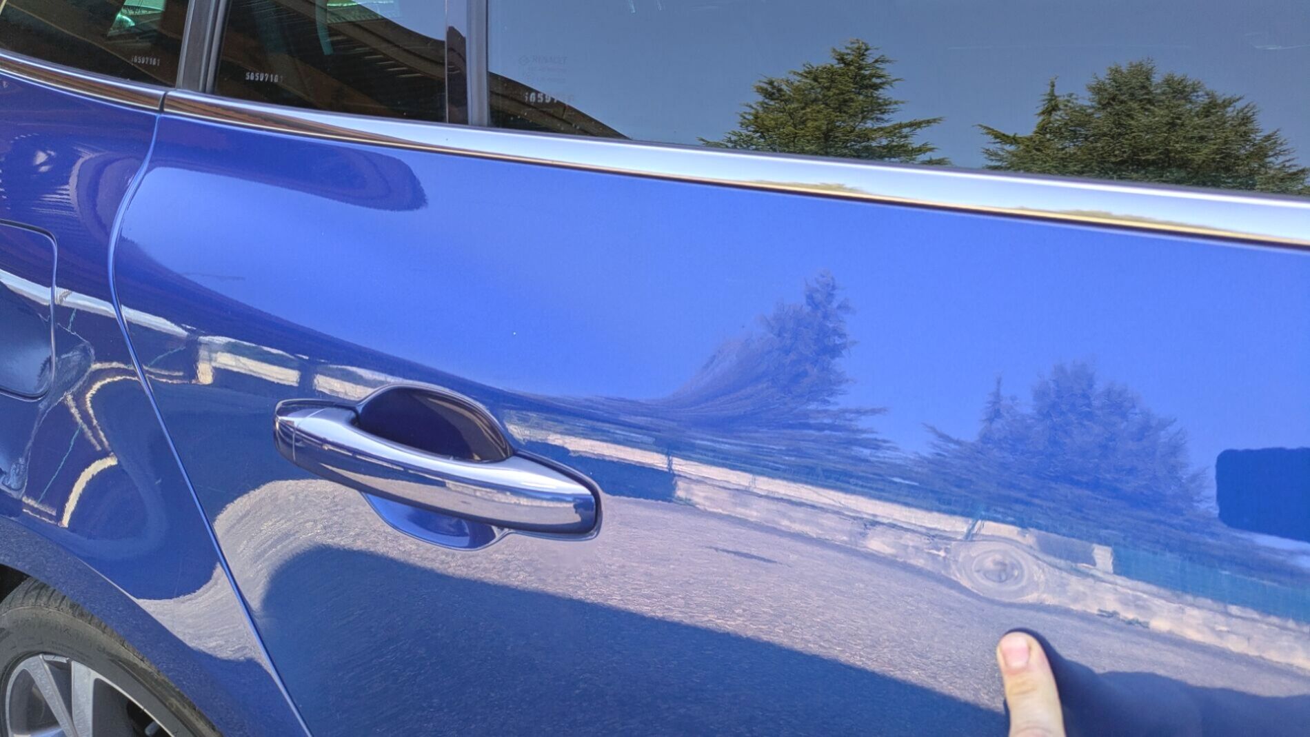 A l’extérieur, le vendeur indique que le véhicule est en bon état. La carrosserie dans sa teinte Bleu Iron présente toutefois quelques traces d'usage : un petit "poc" ainsi qu'une rayure sont signalés sur la porte arrière droite.