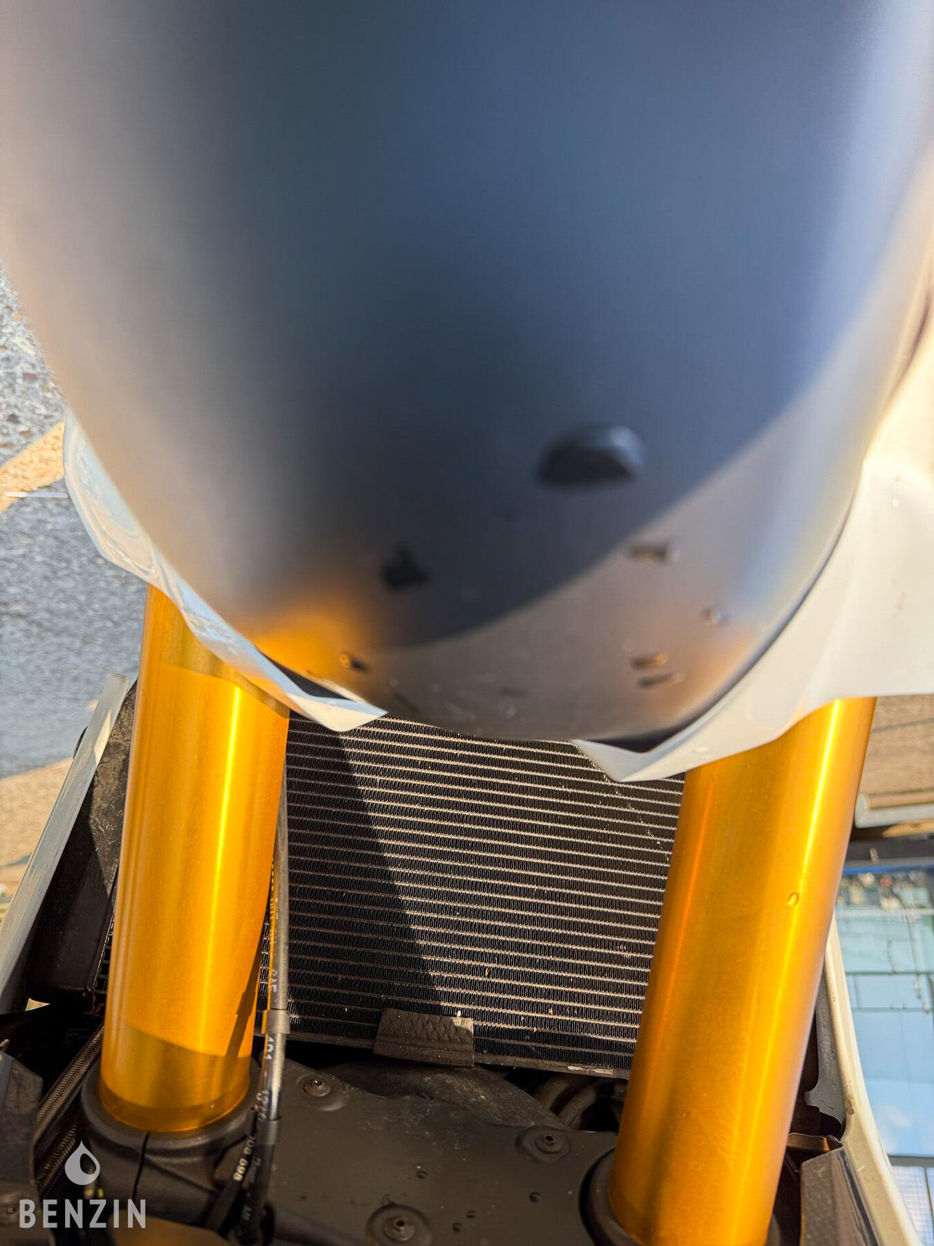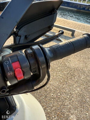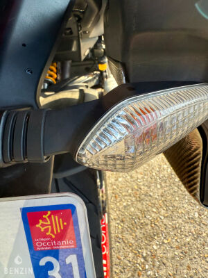 Esthétiquement, la moto est en bon état. La peinture dans sa teinte blanche ne présente que de rares défauts visibles dans la galerie. Les plastiques carénages sont en bon état, tout comme les optiques. La selle en simili noir ne comporte ni déchirures ni trous mais montre de légères traces d’usure. L’instrumentation ainsi que les équipements électriques fonctionnent normalement.