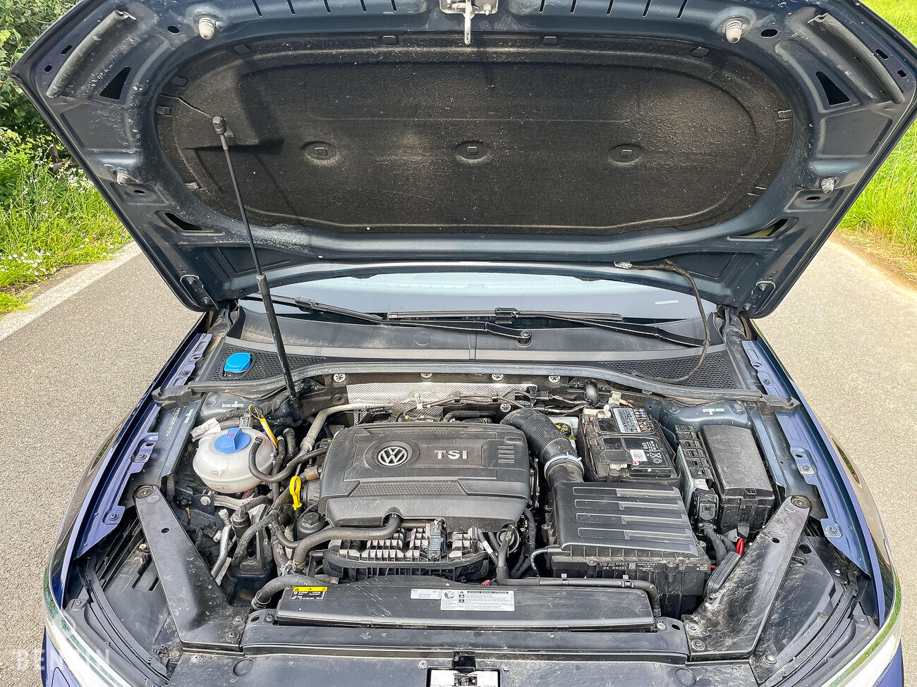 À l’extérieur, le vendeur indique que le véhicule est en bon état. La carrosserie dans sa teinte bleue ‘Atlantik Blue Metallic’ ne présente que quelques défauts visibles dans la galerie. Des photos des soubassements sont disponibles dans la galerie.