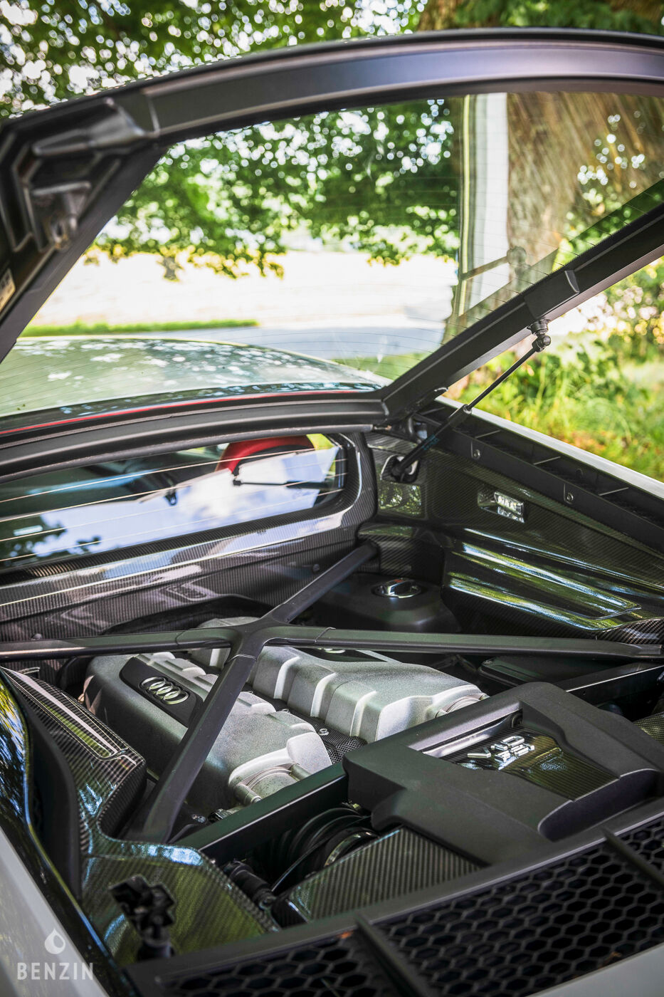 On the outside, the seller says that the vehicle is in good condition. The white bodywork shows only a few flaws, which can be seen in the gallery. This R8 comes with an exterior carbon pack.