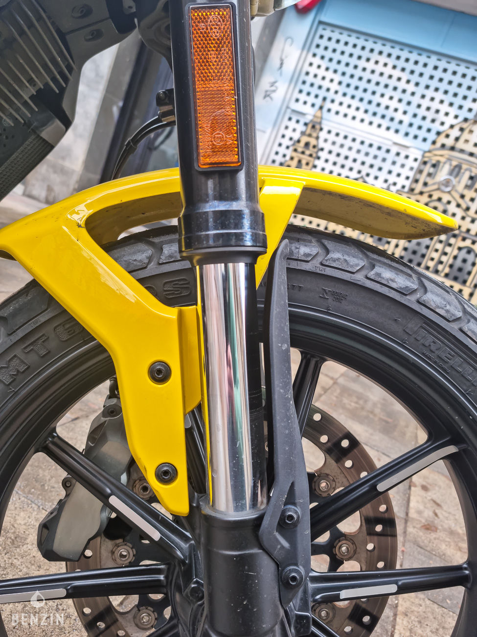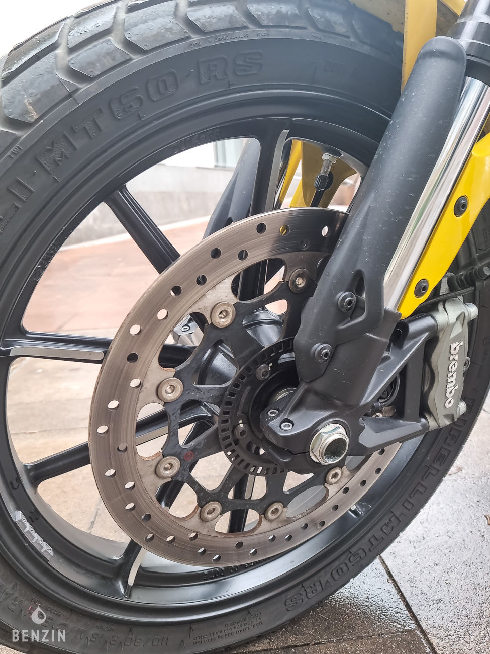 Esthétiquement, la moto est en très bon état. La peinture dans sa teinte jaune ne présente que de rares défauts visibles dans la galerie. Les plastiques et joints extérieurs sont en bon état, tout comme les optiques. La selle en cuir noir ne comporte pas de défauts notables. L’instrumentation ainsi que les équipements électriques fonctionnent normalement.