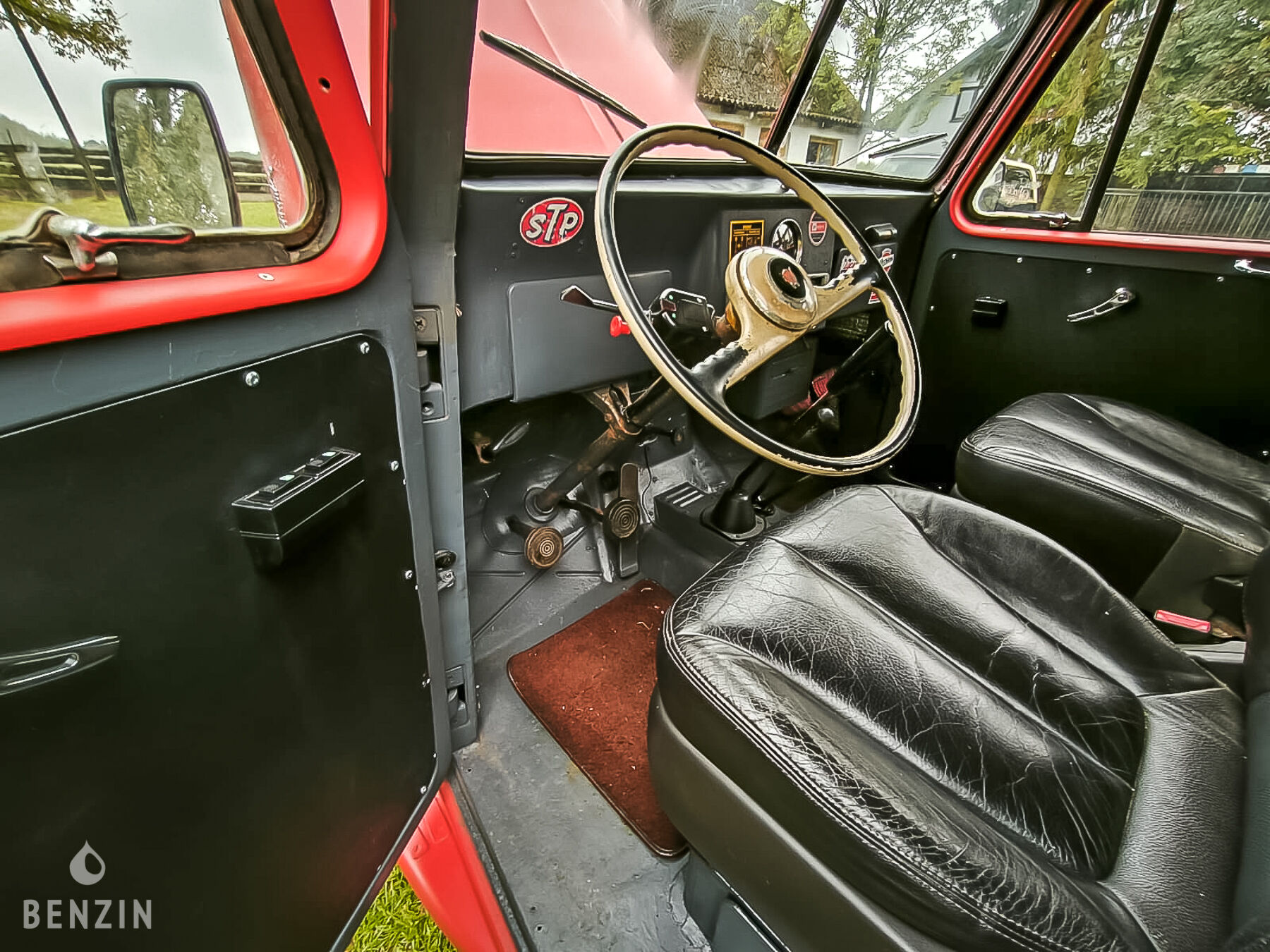 All'interno, il venditore dichiara che il veicolo è in buone condizioni. La tappezzeria in pelle nera (non originale) non presenta strappi o fori e il venditore dichiara che i sedili originali sono in dotazione. Il volante e il cruscotto sono in buone condizioni. La strumentazione di bordo e l'impianto elettrico (6 volt) sono in condizioni normali. Il venditore dichiara che sono stati montati gli alzacristalli elettrici e che il riscaldamento è funzionante.