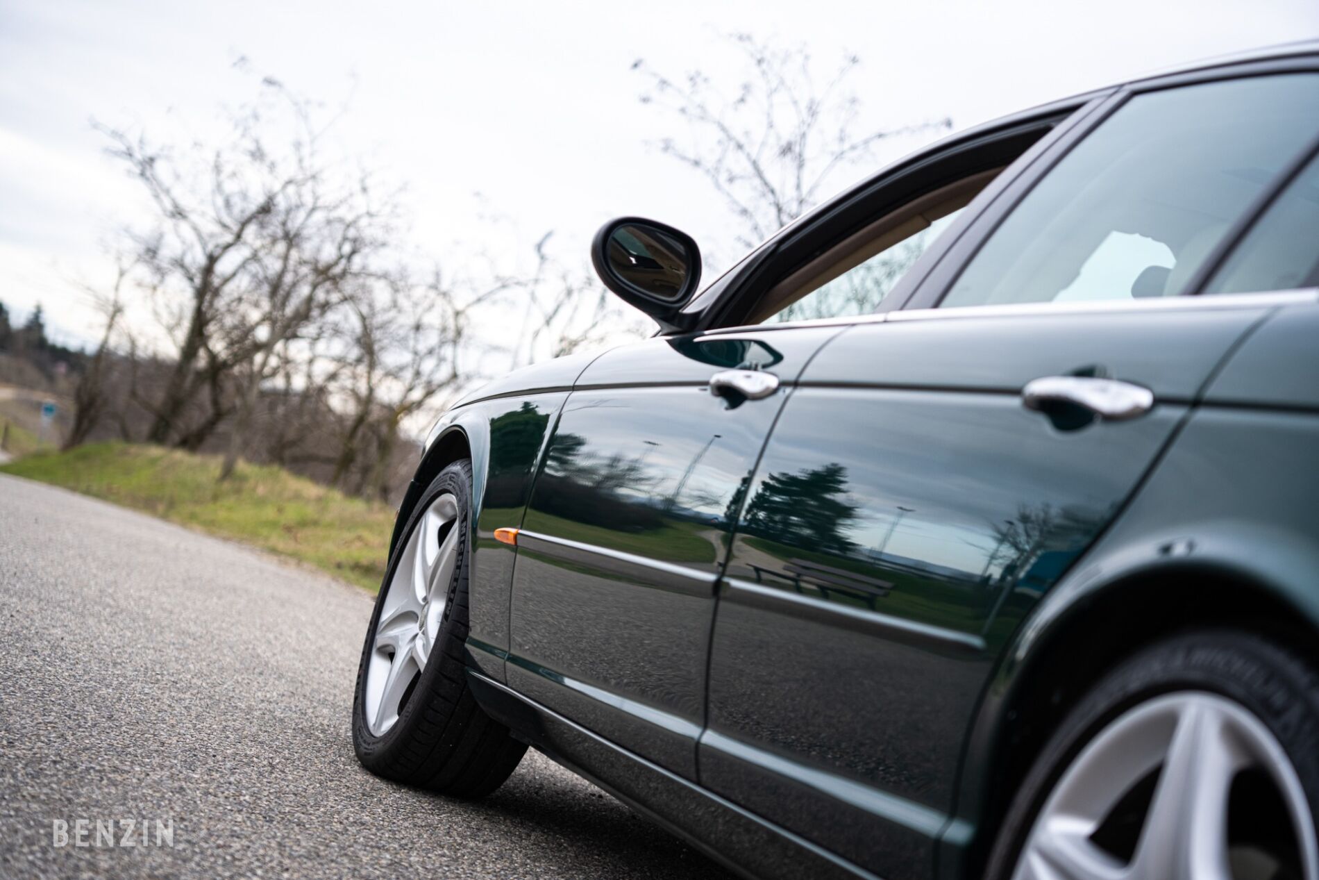 A l’extérieur, le vendeur indique que le véhicule est en bon état. La carrosserie dans sa teinte Racing Green Pearl ne présente que quelques défauts visibles dans la galerie (légers défauts sur les baguettes de protection et frottements mineurs sur les pare-chocs).