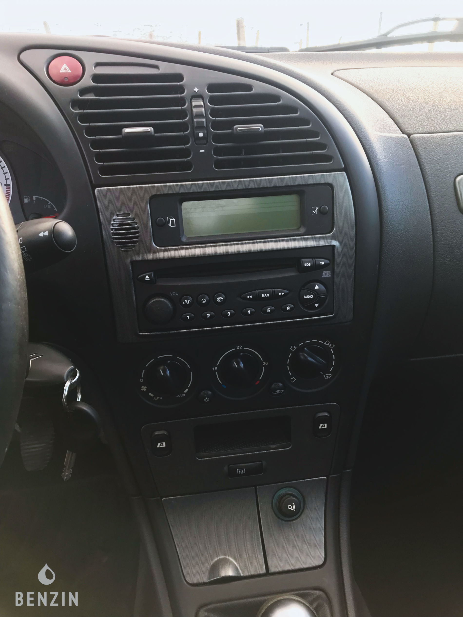 A l’intérieur, le vendeur indique que le véhicule est en bon état. La sellerie en tissu noir présente des traces d’usage. On notera des traces de salissures sur le siège conducteur et un plastique manquant. Le volant et le tableau de bord sont en bon état. L’instrumentation de bord ainsi que les équipements électriques fonctionnent normalement. Cette auto dispose de la climatisation.