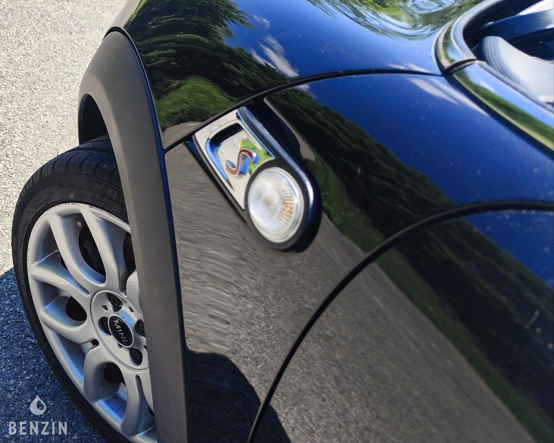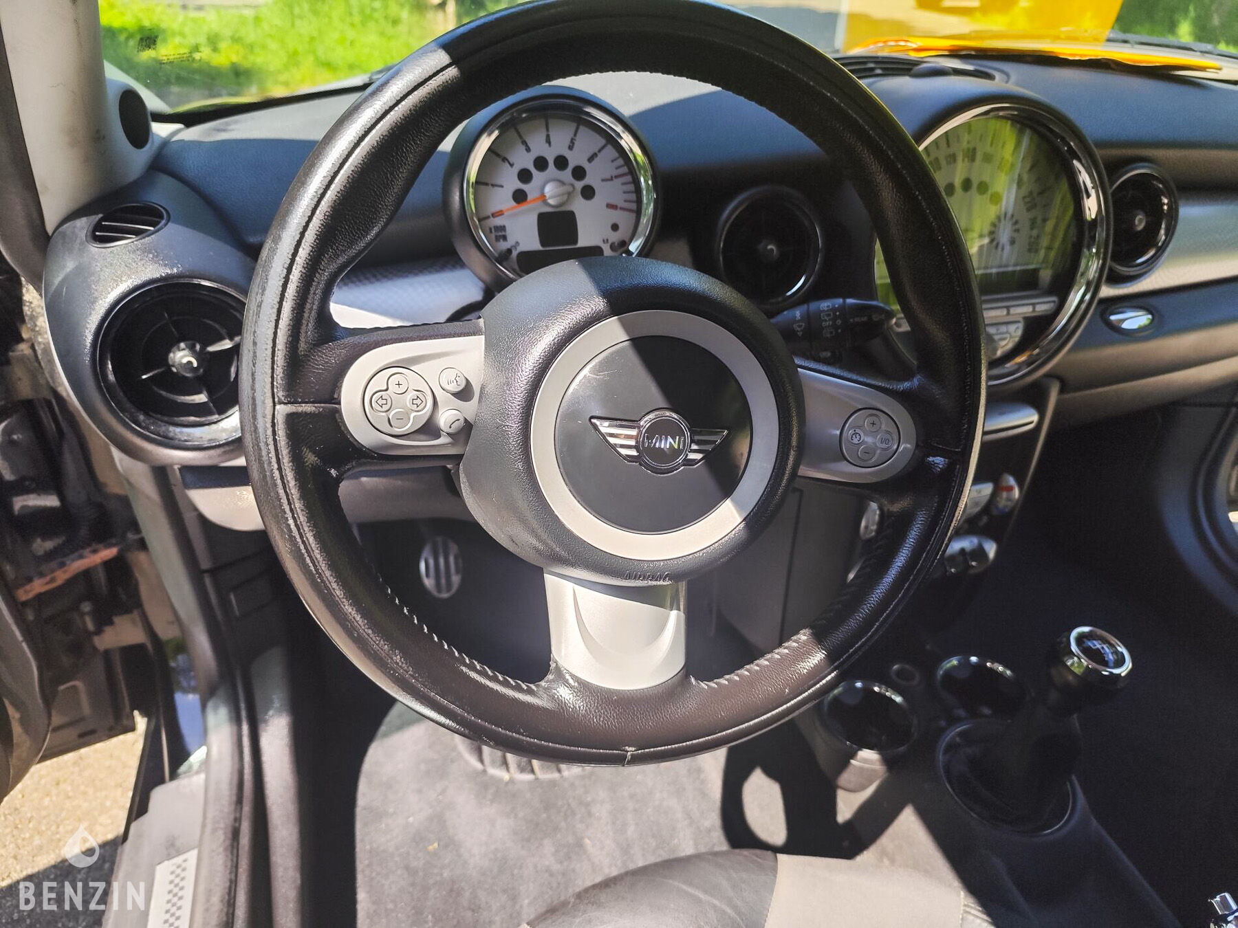 Im Inneren gibt der Verkäufer an, dass sich das Fahrzeug in einem guten Zustand befindet. Die Polsterung aus schwarzem Halb-Leder weist Gebrauchsspuren auf. Das Lenkrad und das Armaturenbrett sind in gutem Zustand. Die Bordinstrumente sowie die elektrischen Geräte funktionieren normal. Die Ausstattungsliste dieses Minis ist in der Galerie zu sehen.