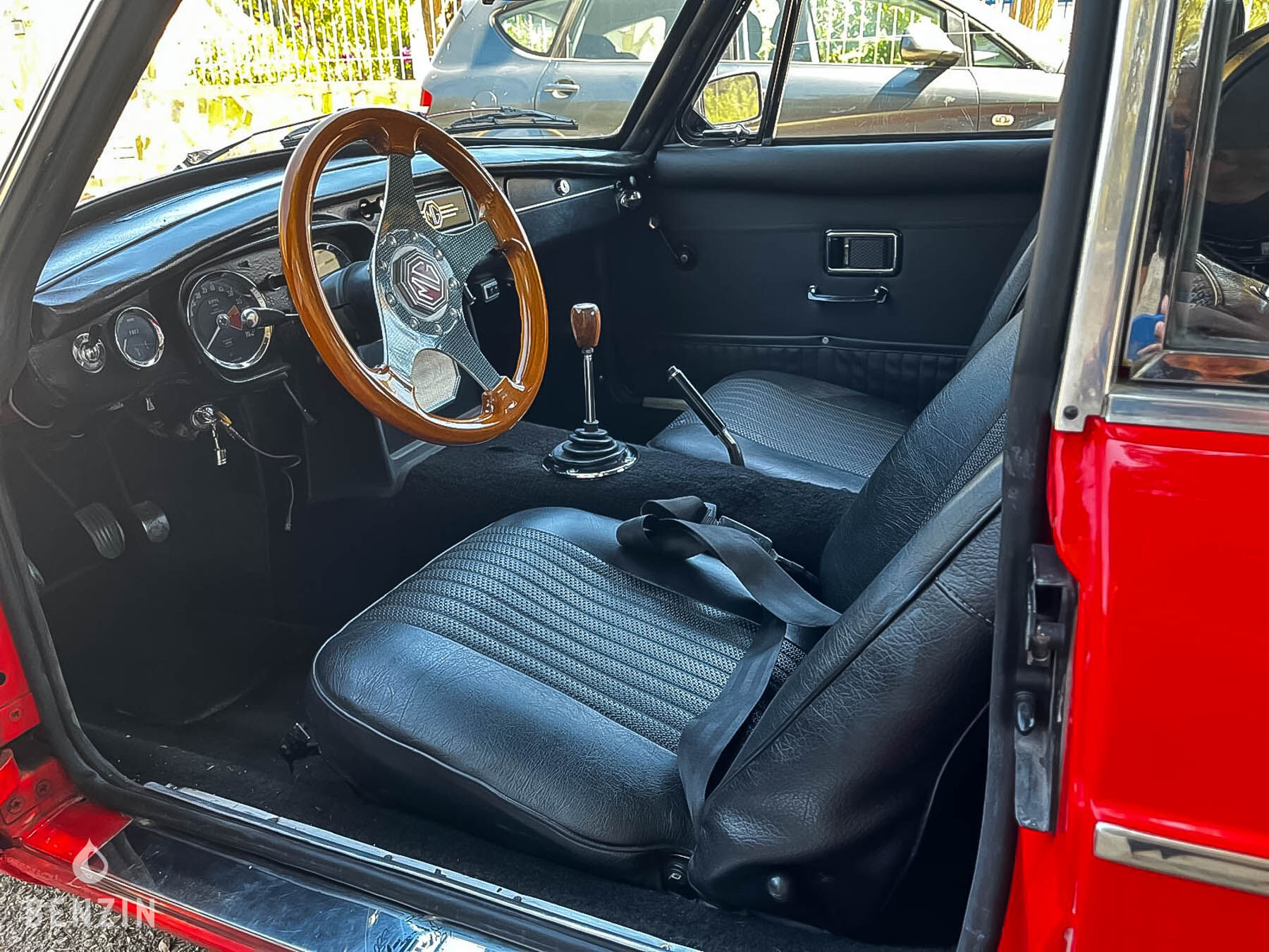 A l’intérieur, le vendeur indique que le véhicule est en bon état. La sellerie en cuir noir ne comporte ni déchirure ni trou mais présente de légères traces d’usure. Le volant et le tableau de bord sont en bon état. L’instrumentation de bord ainsi que les équipements électriques fonctionnent normalement. Le vendeur précise que cette MG B GT dispose d’un overdrive.