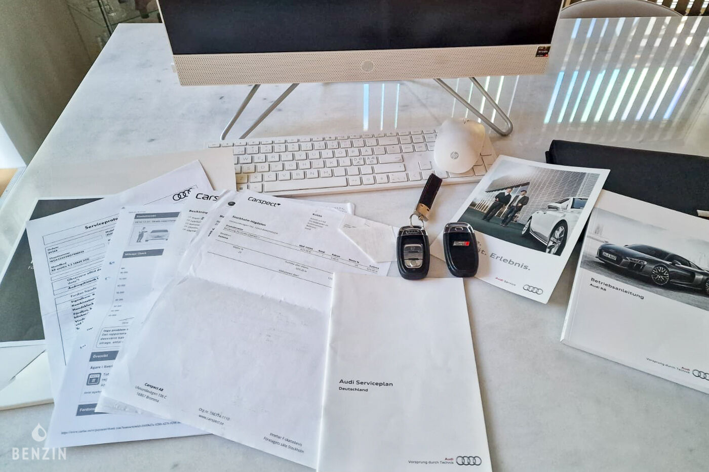 On the outside, the seller says that the vehicle is in good condition. The white bodywork shows only a few flaws, which can be seen in the gallery. This R8 comes with an exterior carbon pack.